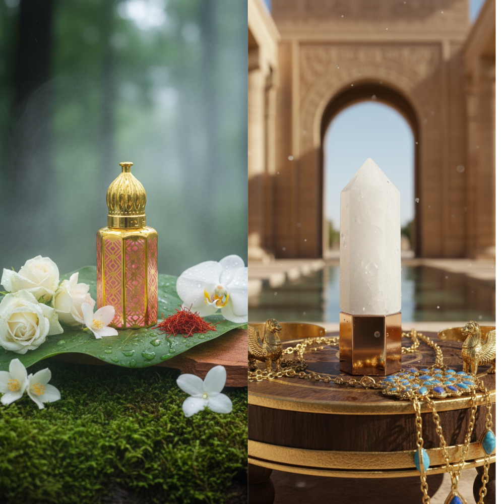 Light Temple blend (100% perfume oils) in a stunning, hard carved Clear Quartz bottle